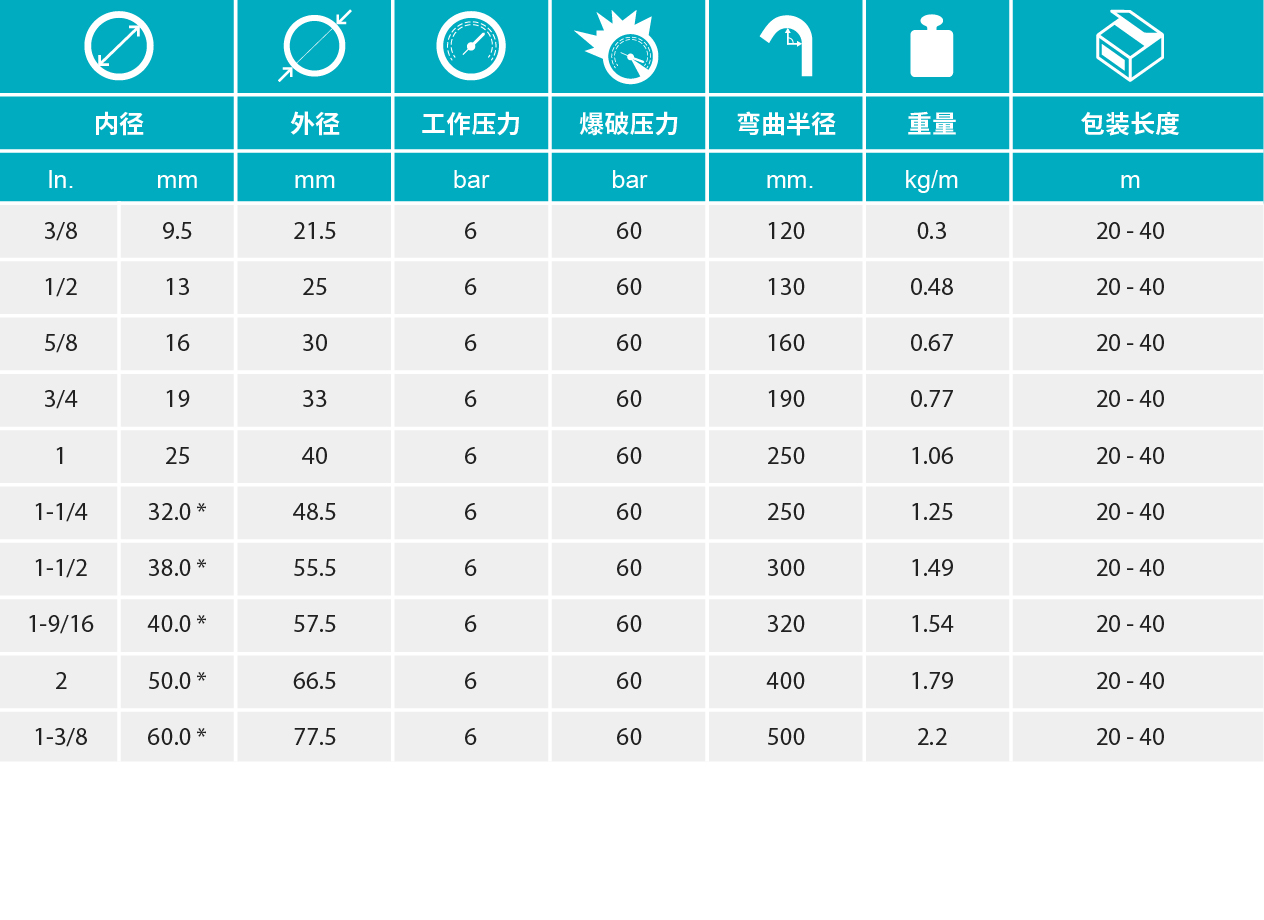 【內層】黑色,光滑;ID≤25mm為EPDM合成橡膠,ID>25mm為SBR合成橡膠
