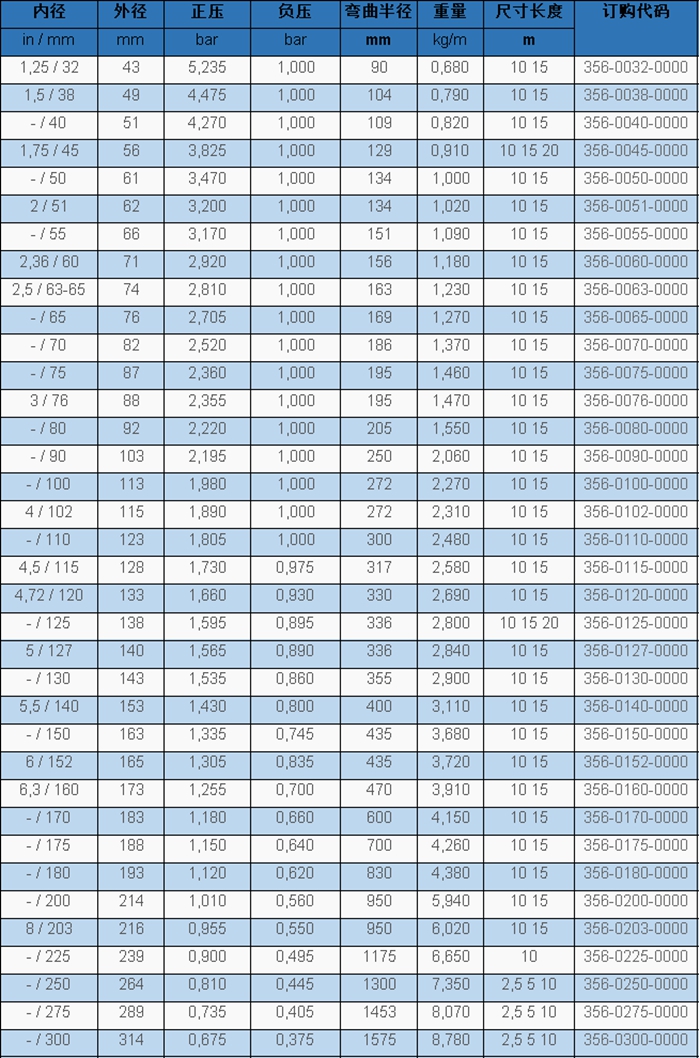 應用: 柔性軟管/用于極其磨損性粉體、散裝物料、顆粒和氣體的高吞吐量軟管輸送;塑料工業,顆粒和粉體輸送:顆粒輸送設備,真空料斗/輸送機,吸入式輸送機,定量給料系統, 散裝-裝卸, 粉碎機, 研磨機,擠出機,注塑成型機;抽吸車:屋頂采沙,屋頂礫石輸送,真空車,抽吸車,干吸車:工業清洗,鍋爐清洗,抽吸挖掘機,爆炸危險區域。農業:谷物氣力輸送機; 混凝土泵:排水軟管,排放軟管;建筑業:鑿巖機,鑿巖機械;原料輸送軟管,如粉體,顆粒,砂子,石英,砂石,碎片和刨花,壓縮機,側槽鼓風機,真空泵,壓力泵,泵,造紙廠,造紙和紙漿工業,包裝機:邊條抽吸系統/邊緣修剪排風系統。表面預處理:拋丸處理/噴砂處理 如用于拋丸室,船場,剝皮機,地板預處理機,研磨機,料倉,槽罐車,油罐車:料倉裝卸,料倉,槽罐車,油罐車:木材顆粒、塑料顆粒及塑料粉末輸送。