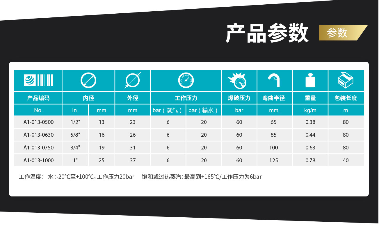 可輸送熱水和高達(dá)+165℃的蒸汽,適用于牛奶場(chǎng)、奶制品車(chē)間、罐頭廠、水產(chǎn)品市場(chǎng)等工作場(chǎng)合的沖洗.也可用于輸送高溫流體食品,可在卷軸上纏繞。