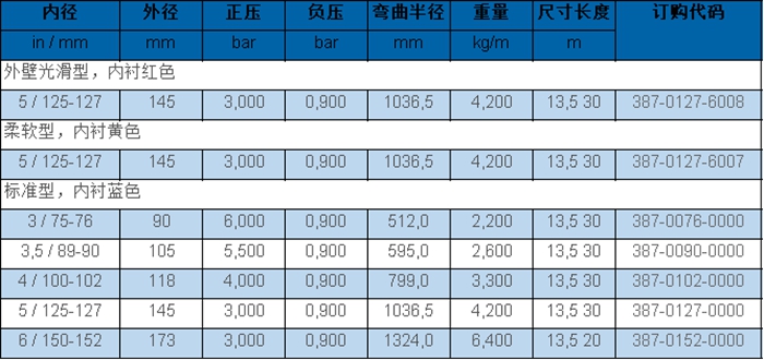 通過外螺旋提供外部耐磨損保護(節省空間,延長壽命,易于使用),超重型,優異耐磨損,耐高壓,真空及壓縮,良好的抗化學性能,良好的低溫柔性,符合 RoHS 規定