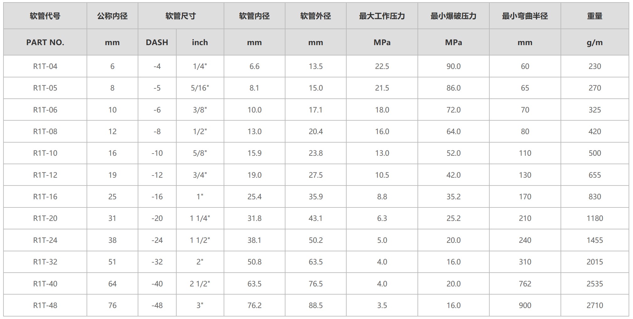 石油基液壓油, 水乙二醇液壓油, 潤滑油, 空氣和水。用于1.7 MPa以上的壓縮氣體場合,軟管需針刺。
