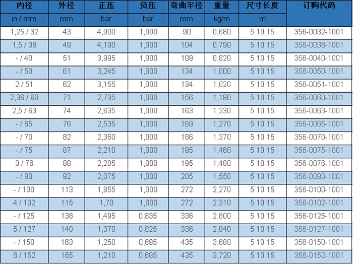 結構:彈性鋼絲牢牢地嵌入管壁內,管壁材料:特殊聚醚聚氨酯 (Pre-PUR®),管壁厚度約為2.0至2.5毫米,加強易被磨損區域。