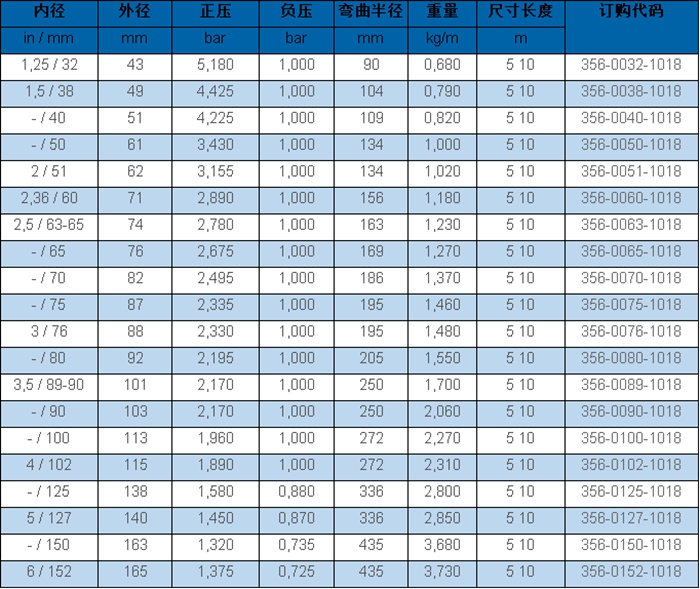 結構:彈性鋼絲牢牢地嵌入管壁內, 螺旋絲: 不銹鋼絲(INOX),管壁: 長久抗靜電聚醚聚氨酯 (Pre-PUR®),管壁厚度約為2.0至2.5毫米,加強易被磨損區域。
