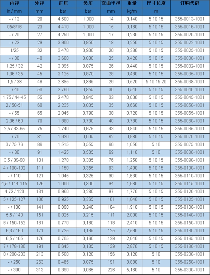 應用:柔性軟管/用于磨損性粉體、散裝物料、顆粒和氣體的軟管輸送,食品工業,制藥工業:食品,制藥,干燥食品輸送,如:大米、麥片、糖、奶粉、各種粉末、咖啡、茶葉、谷物類、面粉、冷凍食品,真空輸送設備,真空料斗,吸入式輸送機,定量給料系統, 制粒機/壓片機,攪拌機,干燥機,包裝機,散裝-裝卸,研磨機,機場,飛機,鐵路車輛,火車,鐵路,小船,輪船/大型船舶,游艇:馬桶排泄/處理,工業真空吸塵器,真空吸塵器,農業:谷物氣力輸送機, 牲畜欄,動物棚:飼料輸送,飼料加工廠,動物飼料運輸,造紙廠,造紙和紙漿工業:廢水,空氣抽吸,工業洗滌機 :水沖洗軟管。